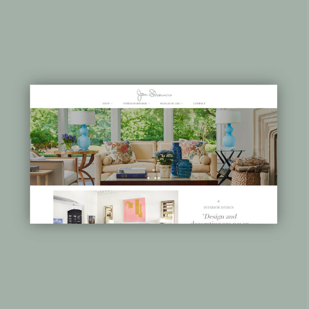 Well-known interior designer Jan Showers business has grown exponentially. This has nothing to do with luck and everything to do with her illustrious talent. So we were honored to have been chosen to take her web site to the next level, and to keep up with her many projects and luxe product lines. Jan Showers is known for creating rooms that stand apart from the usual, and yet, are completely livable and reflect her clients' lifestyles. She and her talented team make sure that each project they do represents something personal about the client, but always with a different approach. Showers' favorite quote is "The first thing I tell my clients is that they need to look great and feel good in their own rooms, otherwise, why bother?" She is known for using luxurious fabrics, leathers, colors that are unexpected, and her ability to mix traditional with mid-20th century modern.